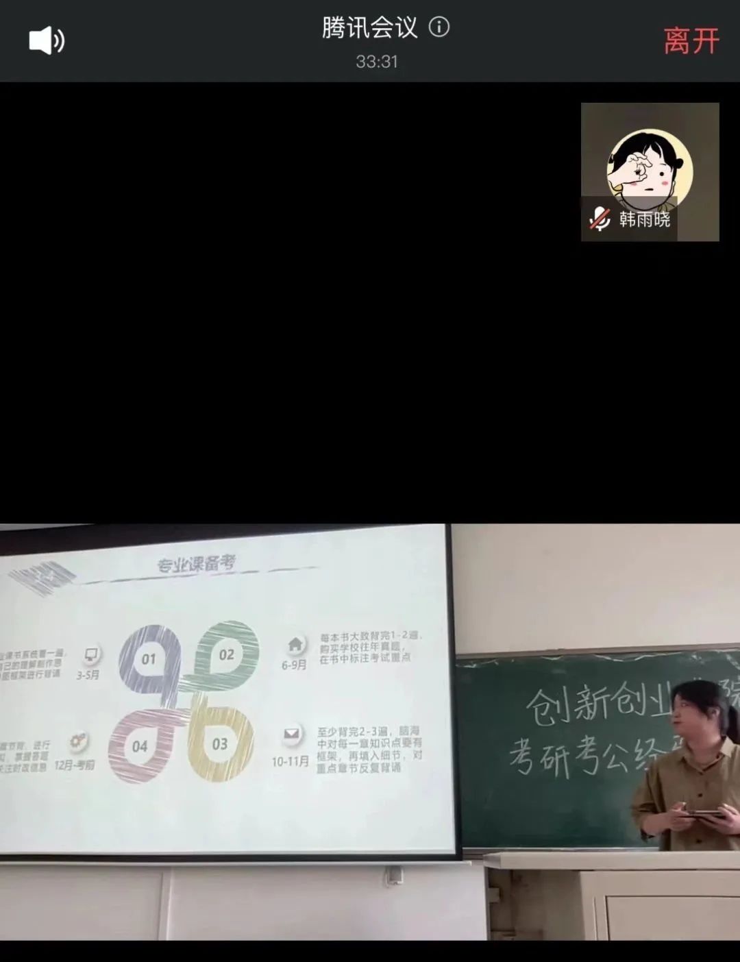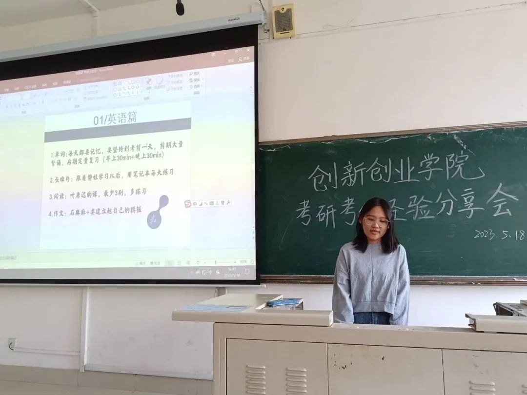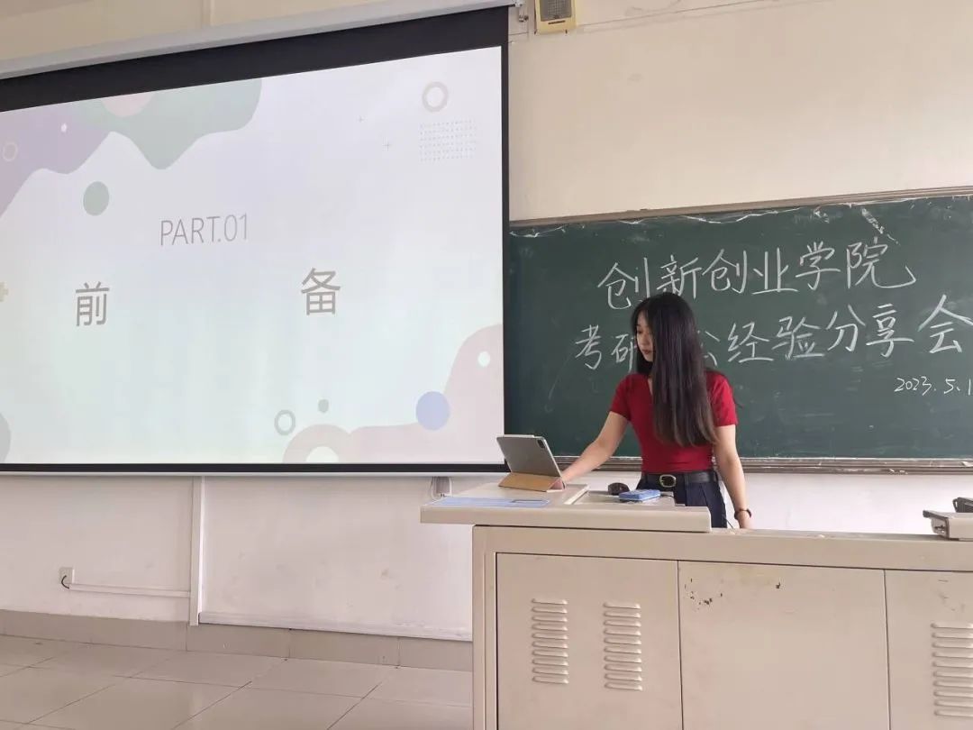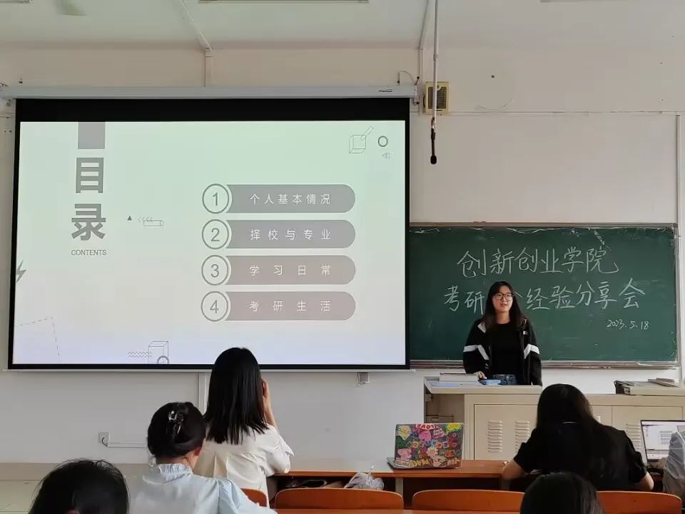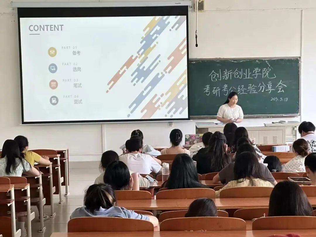 分享会上,辅导员韩雨晓向考研考公成功上岸的优秀学子表示祝贺,并向大家介绍了学院目前的升学与就业情况,肯定了创新创业学院学子勤奋刻苦、积极上进、脚踏实地的学习精神,为正在备考或打算考公考研的学生加油打气。