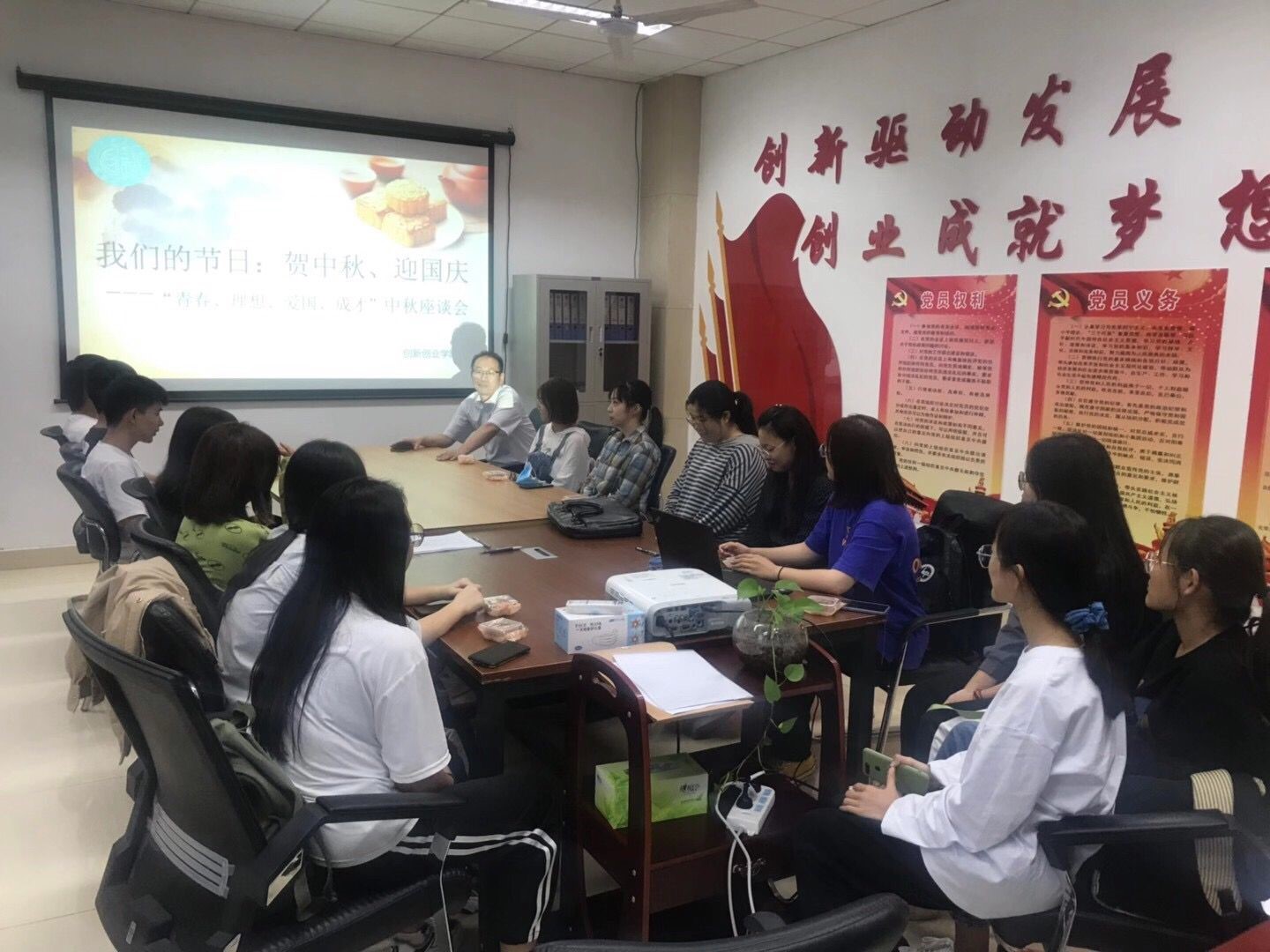 2020年9月30日晚,创新创业学院组织“我们的节日-贺中秋,迎国庆”座谈会。学院院长李厚忠、辅导员黄真、刘秀源老师参加。