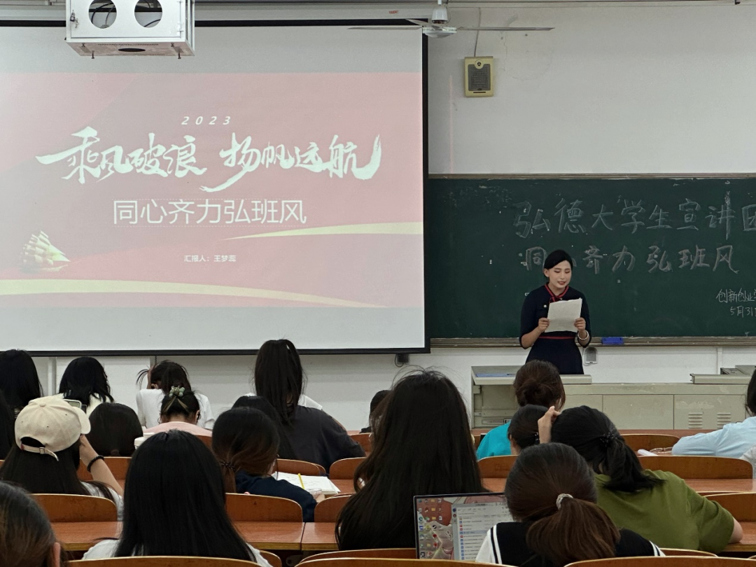 追风赶月莫停留,平芜尽处是春山。当代中国青年生逢其时,施展才干的舞台无比广阔、实现梦想的前景无比光明。优良的班风是青年前进道路上的助推器,王梦蕊同学以“同心协力弘班风”为主题,分享了许多班级的优秀事迹,并呼吁班干部以身作则,为建设优良班风贡献力量。她以个人成长奋斗故事和身边的故事,生动阐释了党的二十大精神,用小故事印证大道理,激励同学们把人生理想融入国家和民族事业当中,勇敢肩负起时代赋予的重任,苦练技能、潜心钻研、勇于创新,不断提高自己的能力和素质。
