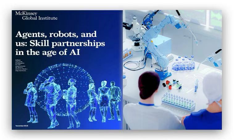 麦肯锡全球研究院(McKinsey Global Institute)于2025年11月发布的报告《人、智能体与机器人:人工智能时代的能力共同体》(Agents, robots, and us: Skill partnerships in the age of AI)标志着人们对职业和能力本质的理解迎来根本性转折。该研究以实证数据为基础,挑战了“人工智能导致人类失业”的简化叙事,转而提出一种“能力共同体”的新范式——人、智能体(处理认知任务的机器)与机器人(处理体力任务的机器)的协同共生,将成为未来经济增长与社会发展的核心架构。报告基于美国的相关数据指出,当前技术虽可自动化美国57%的工作时间,但这并非意味着工作机会的消亡,而是工作内容与能力应用方式重构的信号。通过分析超过1100万条招聘数据及800余种职业,报告揭示:AI不会取代人类技能,但将重塑其应用场景——到2030年,若组织能系统性重新设计工作流,美国可释放2.9万亿美元的经济价值。