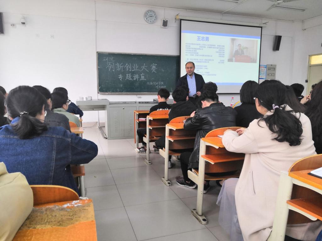 讲座正式开始,王志勇老师围绕创业计划书构成、创业计划书关键内容、创业比赛选题、参赛注意事项四个方面进行了讲解。他结合自身创业经验,重点就如何吸引投资人眼球、客户群体分类、企业价值主张等进行详细的讲解,以帮助同学们更好的理解商业计划书的精髓和撰写要求,为同学们参加“互联网+”创新创业大赛指明了方向。