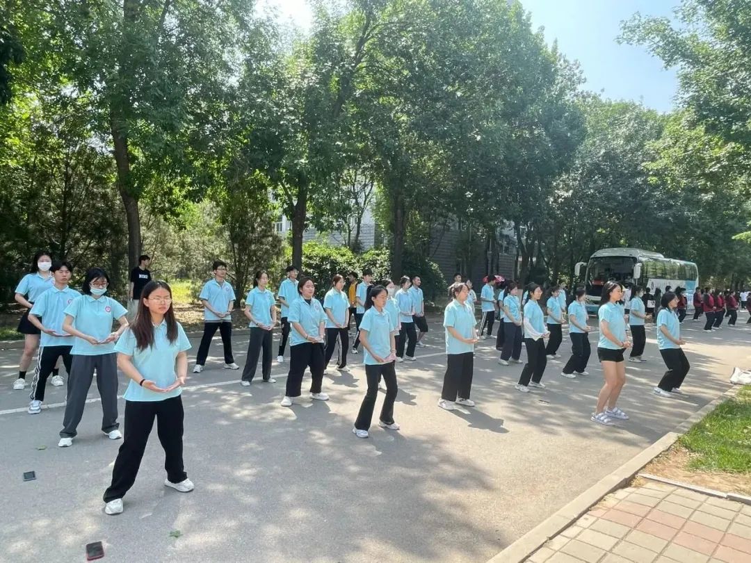 山东女子学院运动场上,伴着阵阵旋律优美的古典音乐,八段锦的音乐口令传入耳畔,创新创业学院学子调整呼吸,认真地练习动作要领。